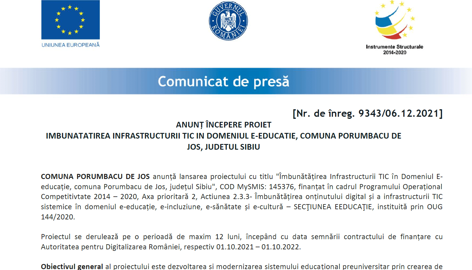 Anunț începere proiect